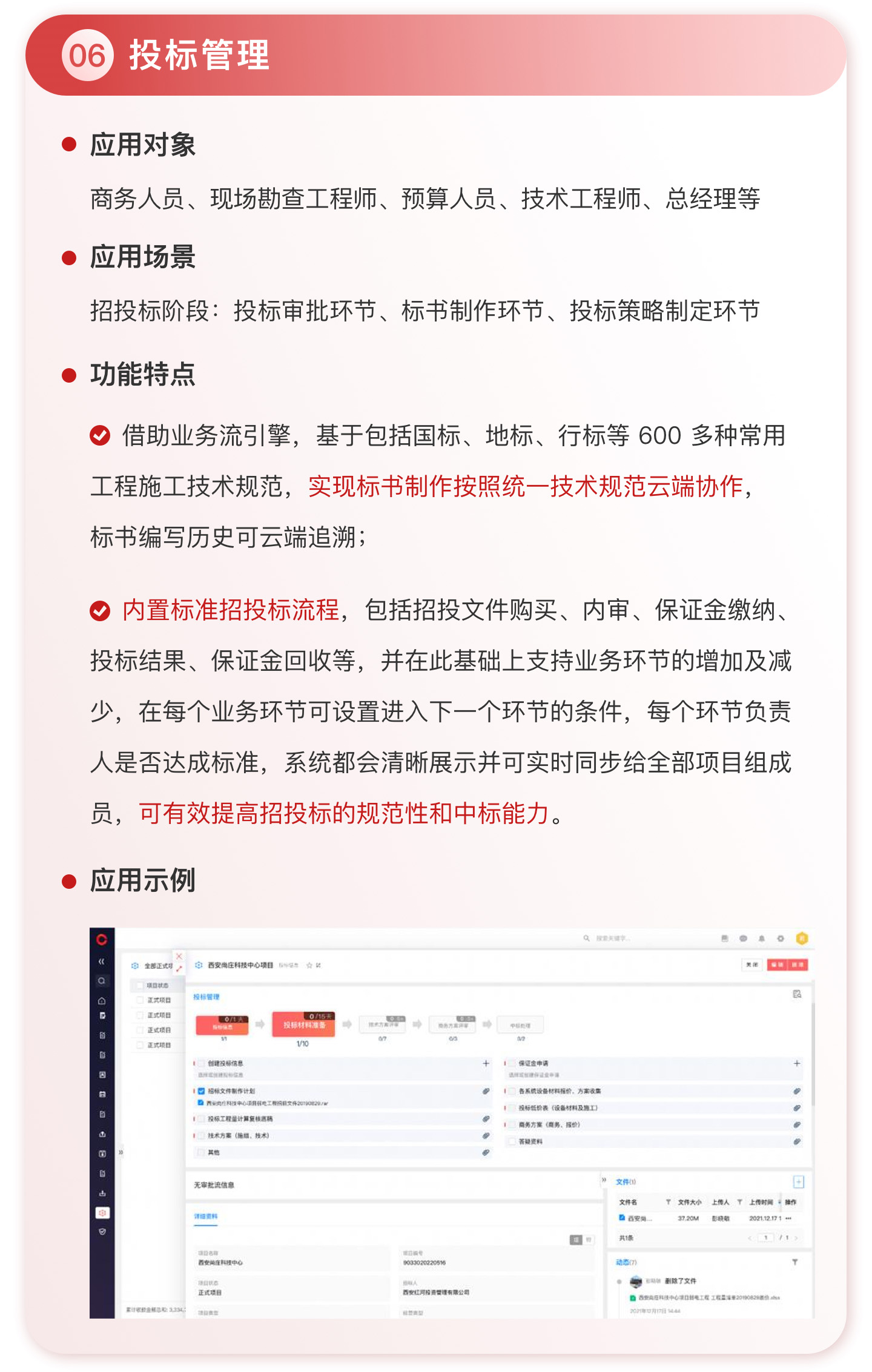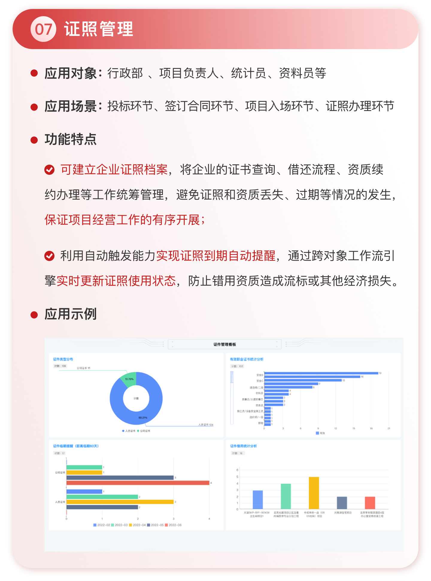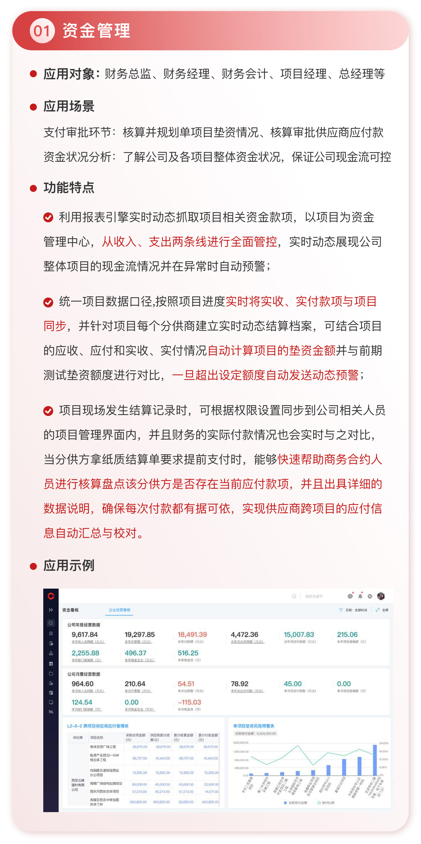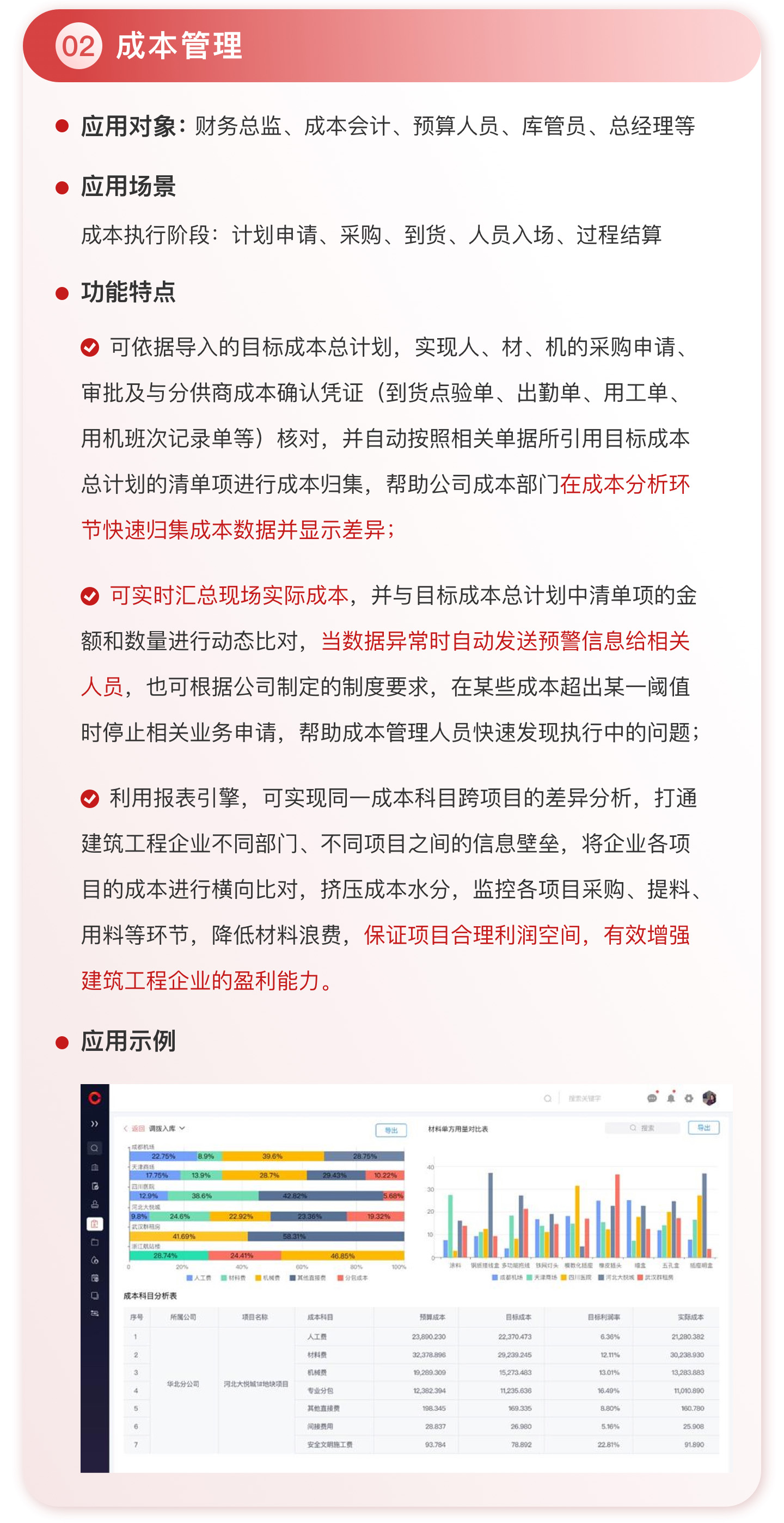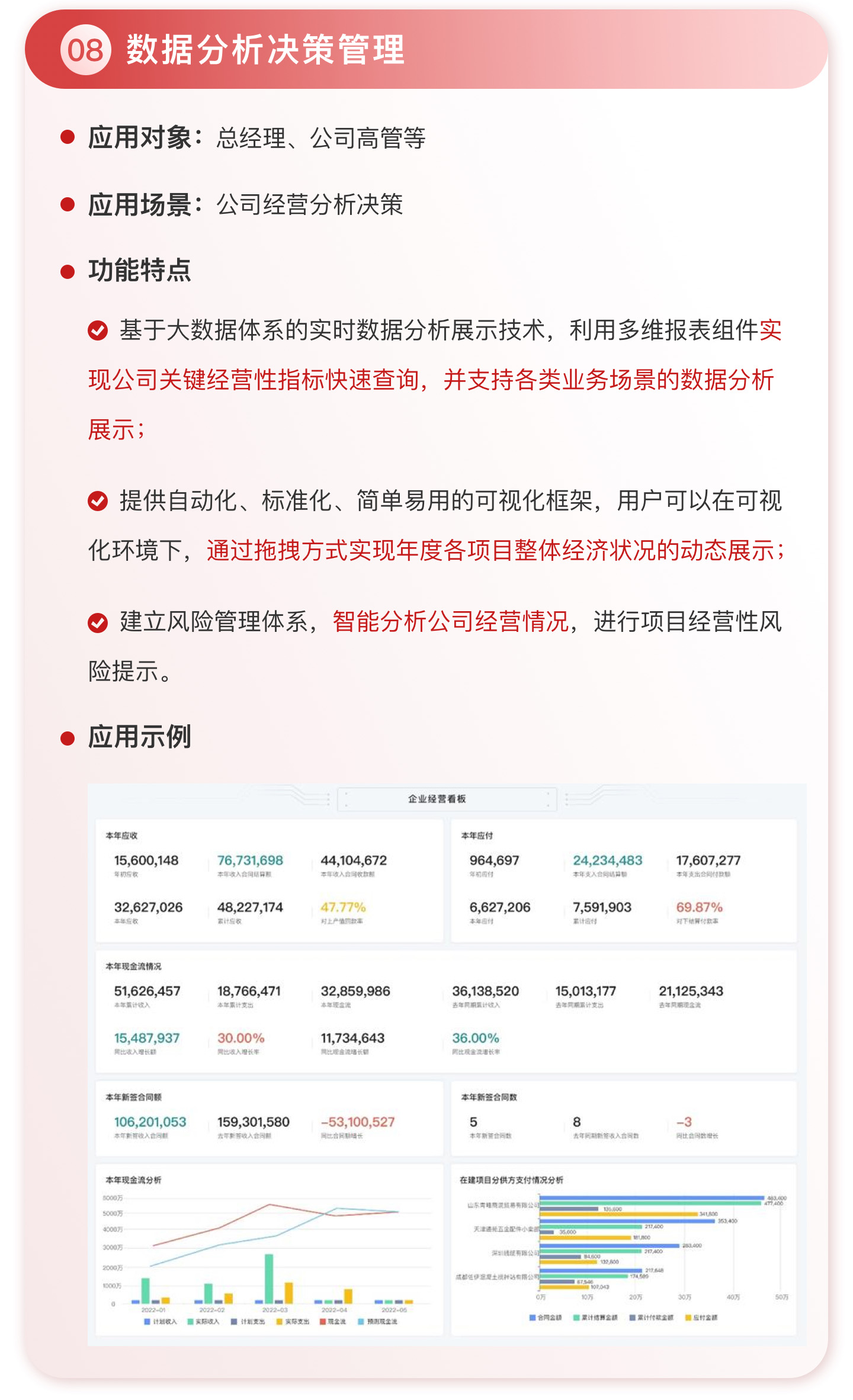 此外,紅圈系統(tǒng)能夠為建筑工程企業(yè)決策者實時呈現(xiàn)動態(tài)數(shù)據(jù)、提供智能數(shù)據(jù)分析,讓管理者實時了解項目的整體運營效率及效益是否達標、經(jīng)營風(fēng)險是否可控,滿足建筑工程企業(yè)數(shù)字化管理升級的需求,提升企業(yè)經(jīng)營管理能力,實現(xiàn)工程項目施工全生命周期的降本增效。該產(chǎn)品主要應(yīng)用于產(chǎn)值為 5,000 萬-20 億的建筑工程行業(yè)企業(yè)。