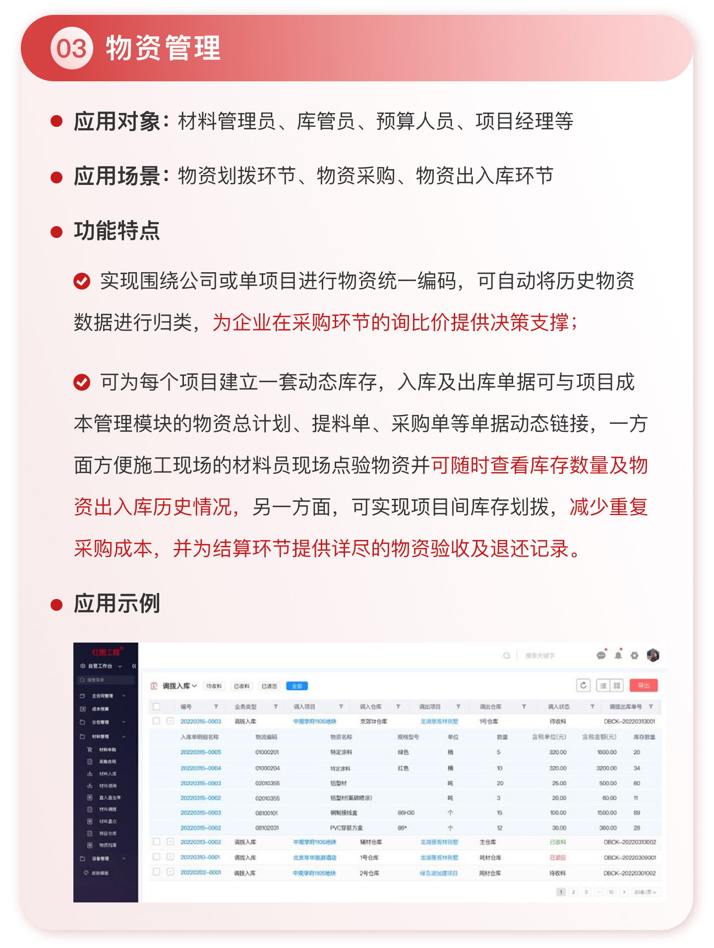 在工程項目管理領(lǐng)域,紅圈在 PaaS 平臺基礎(chǔ)上深入結(jié)合建筑工程企業(yè)的業(yè)務(wù)場景,針對其現(xiàn)金流管理薄弱、成本不可控、項目進度滯后、質(zhì)量問題頻發(fā)和安全風(fēng)險較多等痛點,通過資金管理、成本管理、物資管理、安全質(zhì)量管理、投標管理、勞務(wù)管理、證照管理等功能模塊,使執(zhí)行人員業(yè)務(wù)流程標準化、透明化。