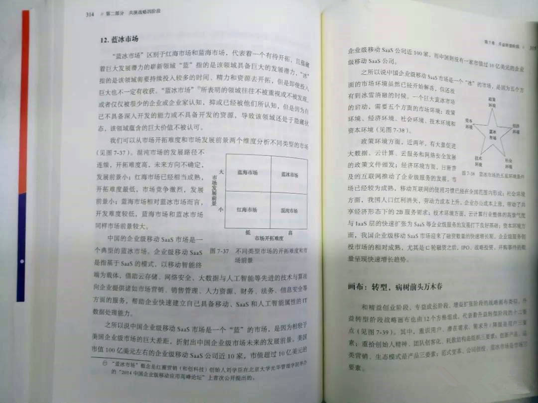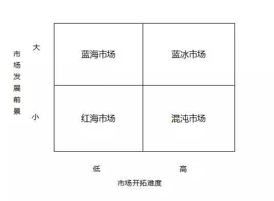 我們可以從市場開拓難度和市場發展前景兩個維度分析不同類型的市場?;煦缡袌龅陌l展路徑不連續,開拓難度高,未來方向不確定,發展前景小;紅海市場已經相當成熟,開拓難度最低,市場競爭激烈,發展前景小;藍海市場相對藍冰市場而言,開發難度較低,藍海市場和藍冰市場同樣市場前景較大。