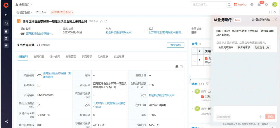 憑借大模型強大的通用智能和推理能力,紅圈AI業(yè)務助手能夠幫助客戶在供應商審核、合同風險評估、付款管控等諸多領域和場景中持續(xù)改善業(yè)務流程,強化分析決策能力,提升用戶使用體驗。