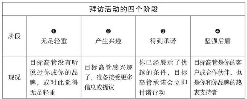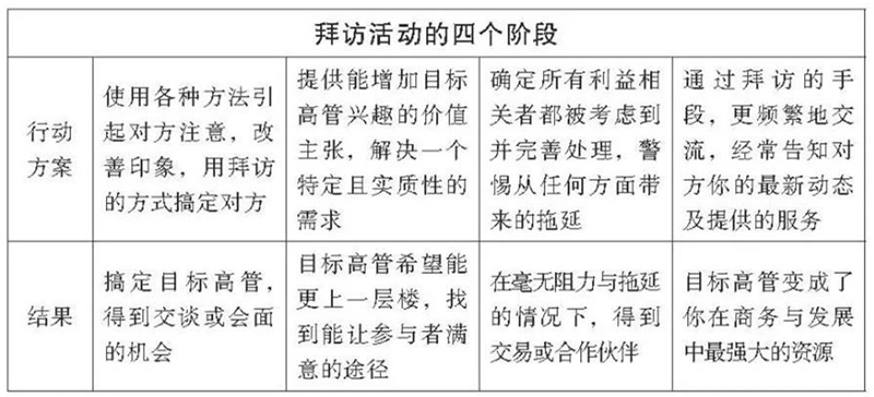 亞馬遜創始人杰夫· 貝佐斯有句很出名的話:“一個人的品牌就是人們背著他時做的評論。”拜訪工作能直接影響他人,尤其是處于第四階段的目標高管對你的評論。難道持續地提供你的信息并與他們保持聯系不是最合情合理的策略嗎?當然是。