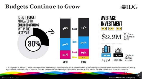 企業預計它們今年在云apps、平臺和服務中的評價投入為350萬美元。在接下來一年預算的分配中,30%分配給了云計算,其中大部分是SaaS(48%)、IaaS(30%)和PaaS(21%)。同時,對云計算應用和平臺的投資也在快速提升,對此企業的平均投資額達到220萬美元,高于2016年的162萬美元。