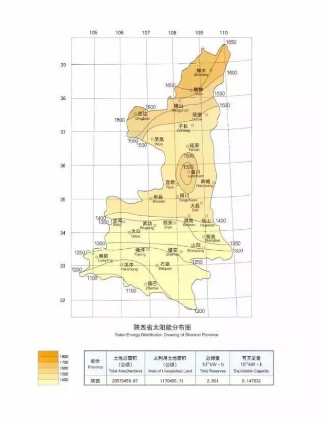 陜西省具有豐富的太陽能資源,太陽能資源空間分布特征是北部多于南部,全省太陽能年總輻射量在4410~5400MJ/m2之間。初步推算,陜西的太陽能資源經濟技術可開發量大約1.1億千瓦。