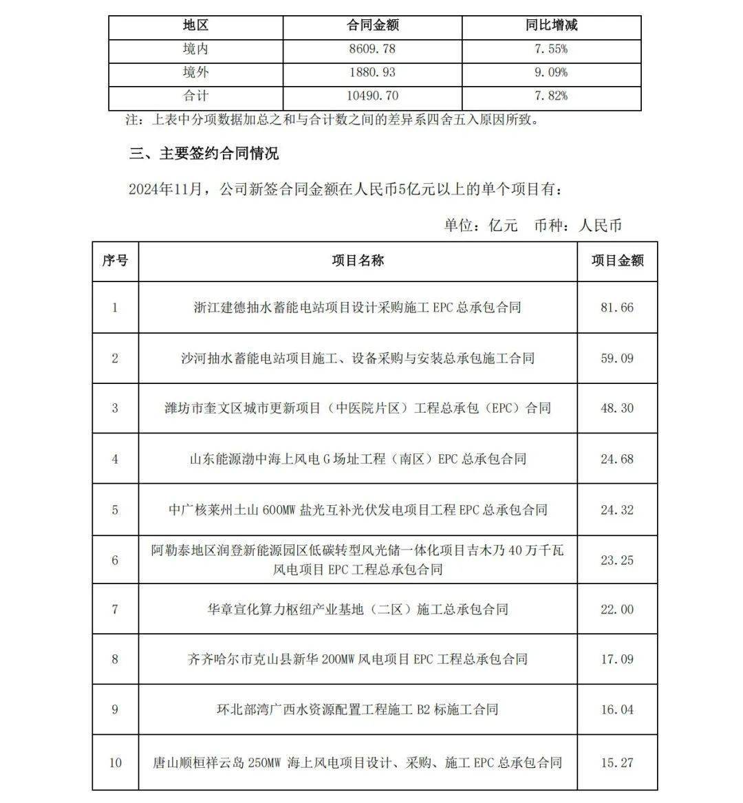 12月20日,中國電建發布《 中國電力建設股份有限公司2024年1月至11月主要經營情況公告》,披露了2024年1-11月,2024年11月,公司新簽合同金額在人民幣5億元以上的單體項目共有40個。