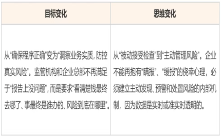 從目標與思維看,過去監管更關注“程序正確”,企業也常抱有“被動接受檢查”的心態;如今則轉向“洞察業務實質、防控真實風險”——監管機構與企業總部不僅要“報告沒問題”,更要“看清錢去哪、事誰辦、風險在哪”,企業也必須建立主動發現、預警、處置風險的機制,畢竟數據已實現實時或準實時透明。