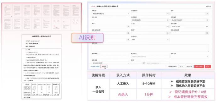 項目竣工階段涉及合同收尾、結(jié)算管理與數(shù)據(jù)歸檔,是實現(xiàn)項目閉環(huán)的關(guān)鍵。紅圈系統(tǒng)通過合同管理模塊對合同履行、變更與結(jié)算過程進行跟蹤,規(guī)范合同體系,規(guī)避履約風(fēng)險。合同全生命周期管理功能支持動態(tài)實時監(jiān)察,確保合同條款執(zhí)行到位,并及時處理爭議與變更事項。同時,紅圈AI系列智能產(chǎn)品中的AI錄單助手能夠自動識別合同關(guān)鍵條款,準確提取付款比例、付款條件、價稅金額等信息,為后續(xù)履約執(zhí)行提供重要參照。