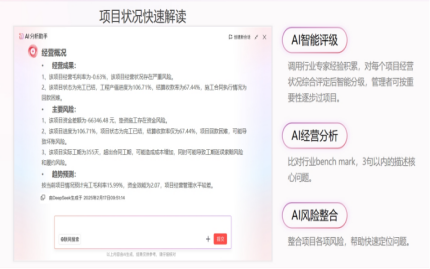 你的項目“智能指揮官:面對一個復雜的項目,如何快速抓住經營全貌?項目360°AI解讀功能,可以整合全維經營指標(資金/成本/合同/付款等),一鍵生成項目全景作戰圖。大模型會替你深度解讀經營風險與應對策略,將復雜數據轉化為清晰的決策語言。它能調用行業專家經驗對項目狀況進行智能評級和經營分析,針對問題給出改進建議,據測算能讓經營決策效率提升10倍。